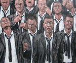 2007groep wachtende mannen in zwarte pakken, vervallen tot uiteenlopende stadia van verveling